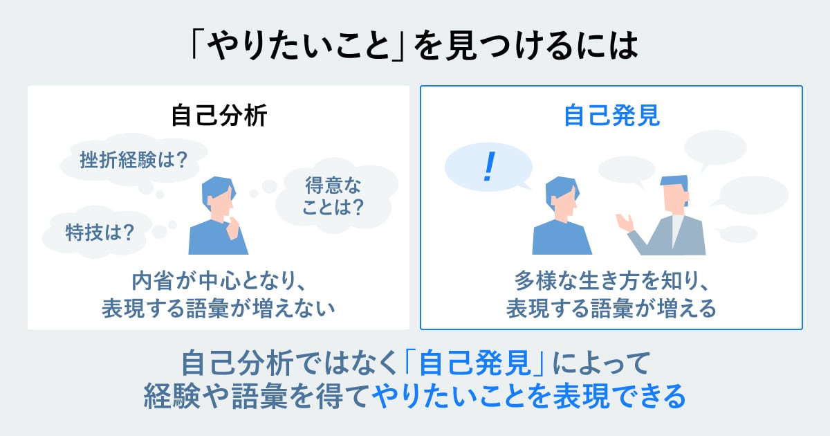 様々な社会人や会社と出会い、多様な生き方を知っていく中で、自分の持つ価値観や感情を仕事・人生においても表現できるようになっていきます。自己分析ではなく「自己発見」によって経験や語彙を手に入れて、自分のやりたいことを表現できる幅を広げていけると良いでしょう。