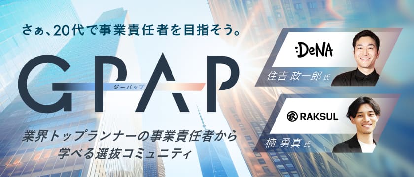 長谷川:GPAPは、「若手のうちからビジネスの一線で活躍、挑戦したい」「事業責任者や事業を拡大するために必要なスキルを習得したい」という方向けの選抜コミュニティです。大きな特徴は、ベンチャーで事業をグロースしてきた経営者や事業責任者といった方々から、直接指導を受けられる点にあります。これまでDeNA AI Link 代表取締役社長/グループエグゼクティブである住吉政一郎さんや、株式会社FUSION(ラクスルグループ)取締役の楠勇真さんなどに登壇いただいています。