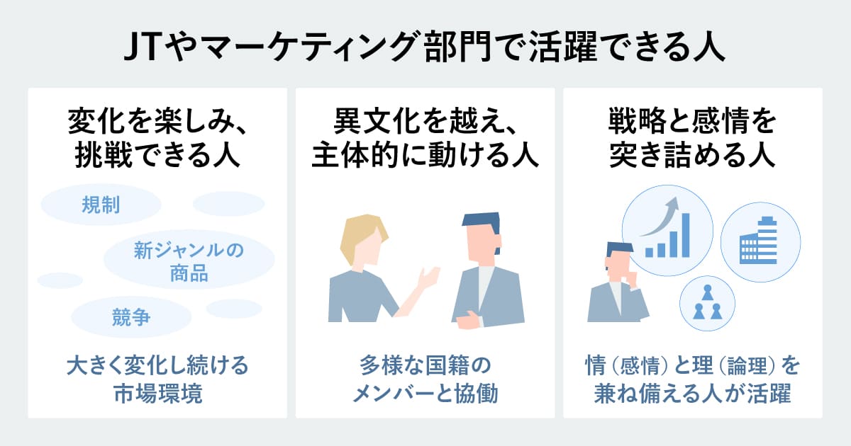 こうした変化をポジティブに捉え、次々と新しいことに挑戦していける人はJTで活躍できると思います。また、グローバルでの仕事においては、文化の違いからくるコミュニケーションの難しさなどの苦労もありますが、それを「より良くする」ためのプロセスとして捉え、主体的に動いていけることが重要です。