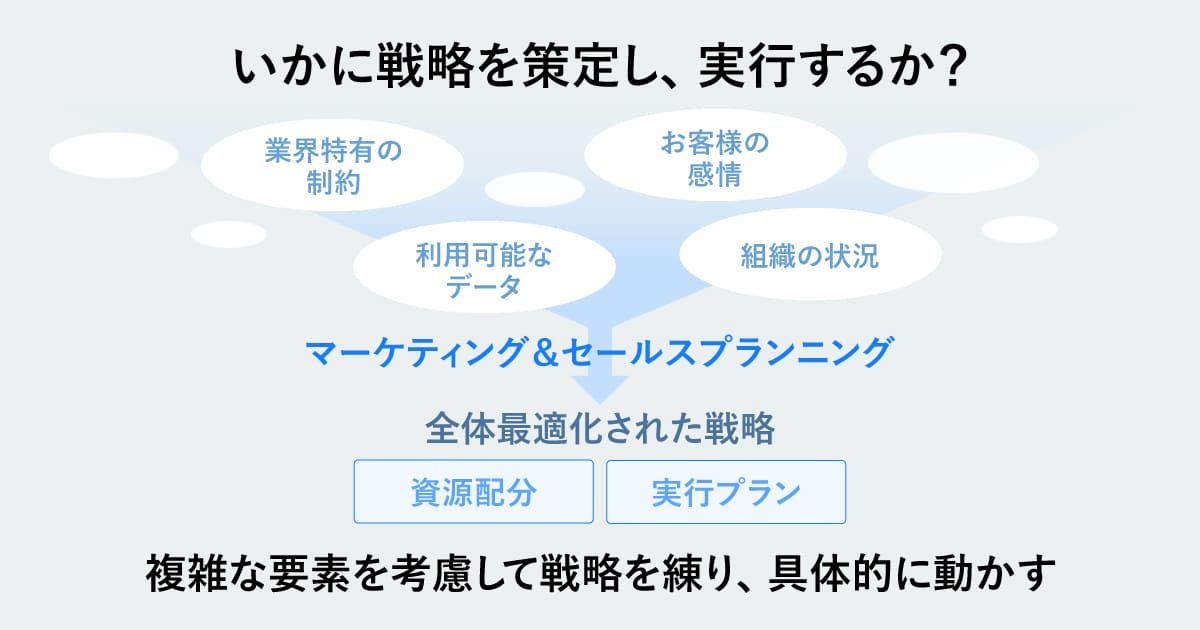 私たちのマーケティング&セールスプランニングでは、こうした複雑な要素をすべて考慮したうえでプランニングを行っています。その中で最も大切にしているのは、データや理論に基づき、常にお客様を起点に考えることです。一方で、それだけでは十分ではありません。