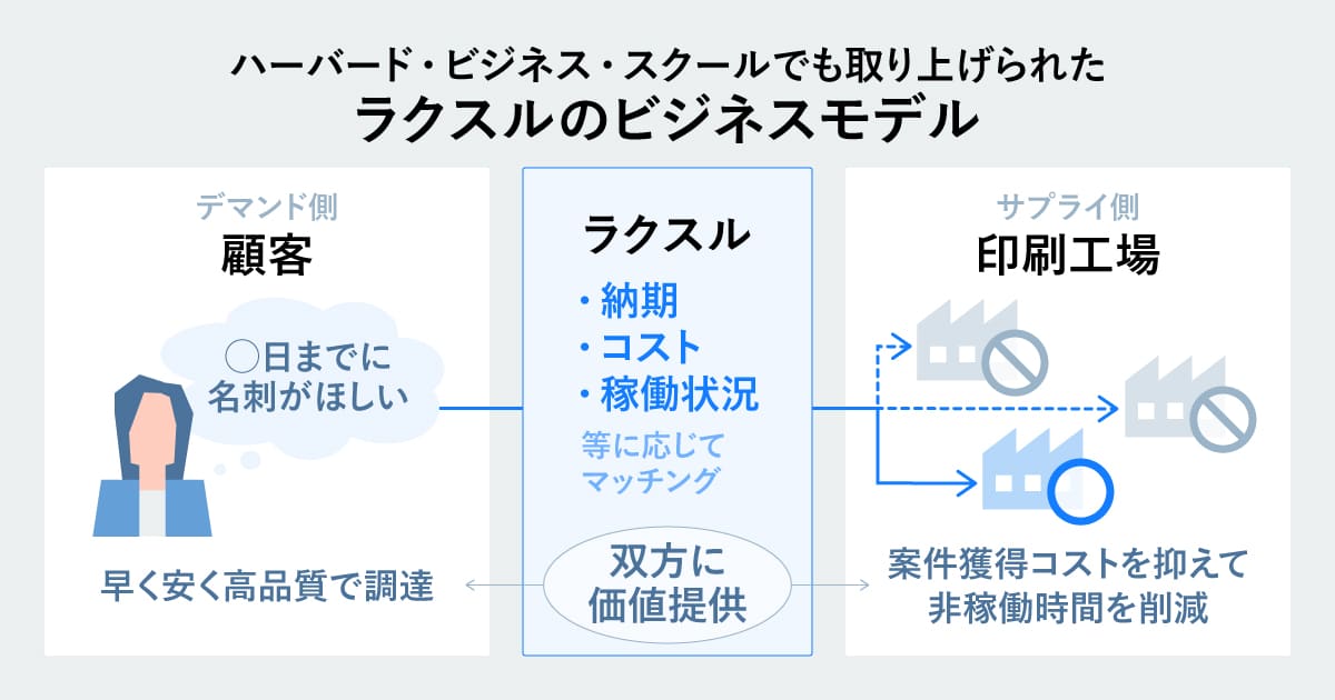 ⸺産業の仕組みを変えるラクスルのビジネスモデルは、海外MBAの最高峰とも称されるハーバード・ビジネス・スクールの教材として取り上げられるなど注目されています。具体的にどのようなものなのでしょうか?