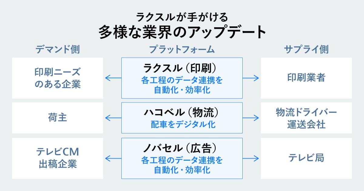 祖業の印刷サービス「ラクスル」と同じような非効率を抱えるBtoB領域へと事業領域を拡張し、物流業界(ハコベル)や広告業界(ノバセル)などに参入しています。