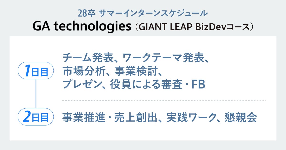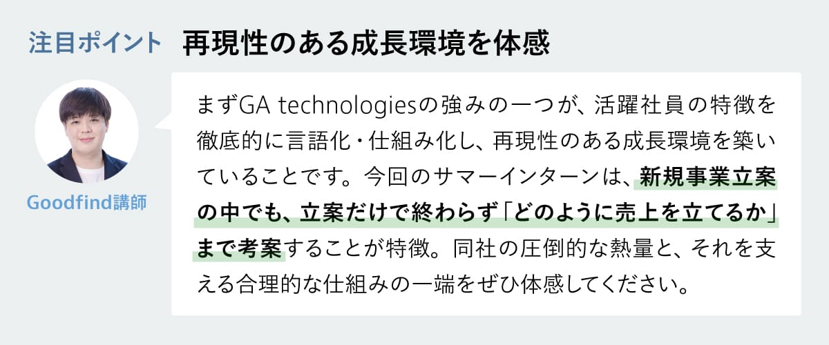 この2日間、皆さんには「インターン」や「ジョブ」といった職業体験の延長線上ではなく、事業を動かす当事者として参加してほしいと思います。我々GAの社員は、人生を賭けて事業を創り、運営しています。「自分がこの事業を勝たせるんだ」という強い意識を持って挑むことで、見える景色が必ず変わります。この2日間だけは単なる学生ではなく、当事者として事業を背負う「覚悟」と「責任感」を持って挑戦してほしいです。
