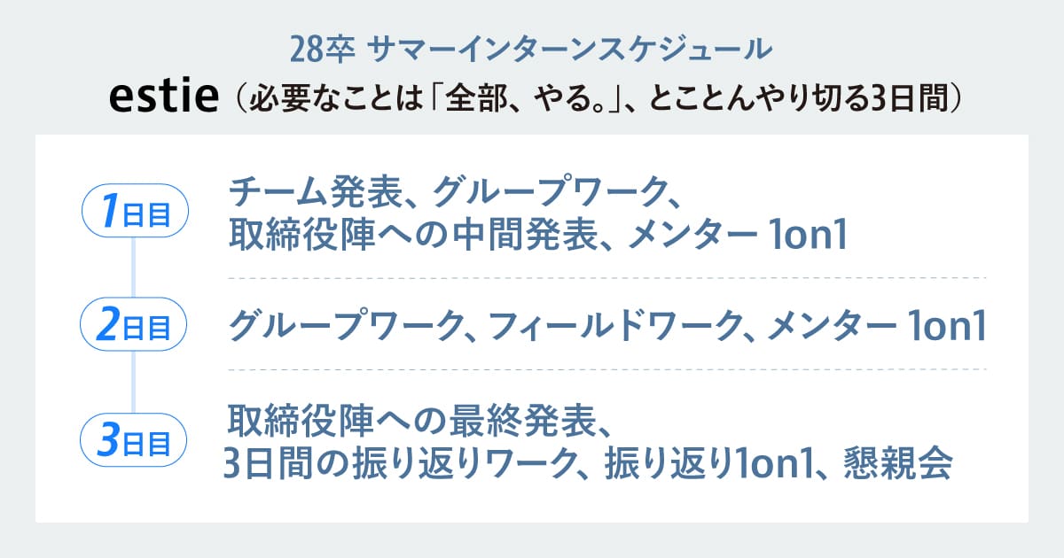 「産業の真価を、さらに拓く。」をPurposeに掲げるestie。新卒二期生となる28卒の3daysインターンシップでは「Unlock Tokyo’s Potential」をテーマに、実際にお客様に提供しているプロダクトを触り、会議室での議論だけでなく会社を飛び出しリアルな街の様子を体感するフィールドワークを通して「東京の各エリアのポテンシャルを解放するために、誰にどんな提案をするのか」を考え、最終日に発表していただきます。