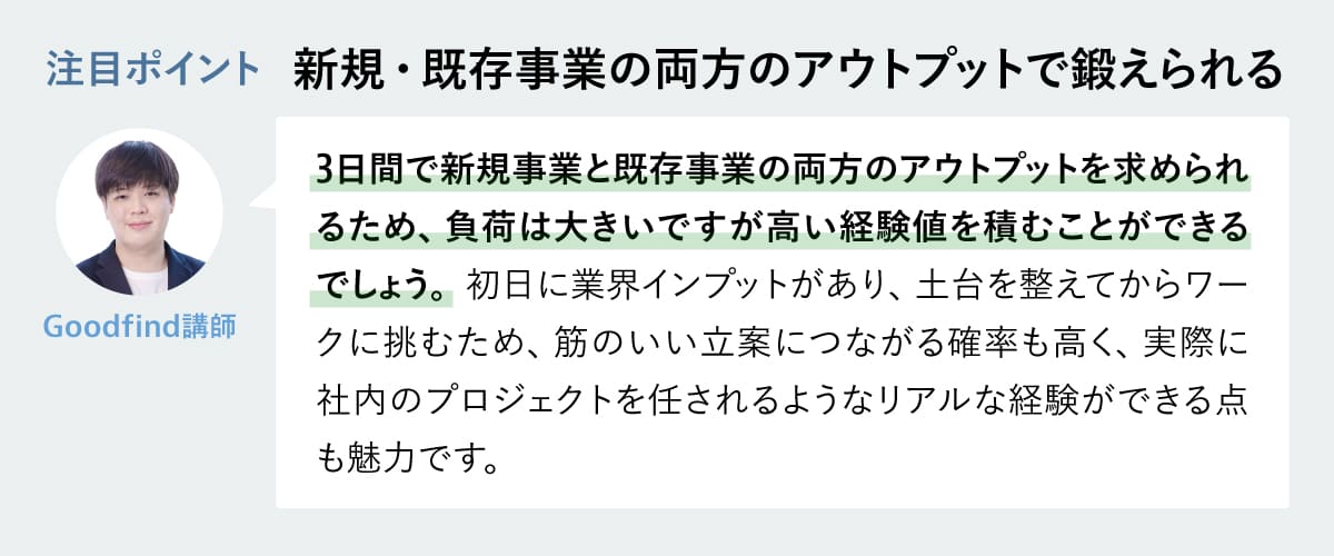 最大のこだわりは、毎日行われる「個別フィードバック」。ビジネススキルだけでなく、個人の思考の癖やマインドにまで踏み込む深さが特徴で、「最も成長できた」「視座が劇的に上がった」と参加学生から熱烈な支持を集めています。